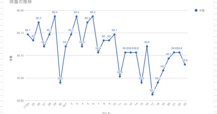 食事は特に気にする程度でもなく、朝ごはんの菓子パンをなくすように意識して、朝昼晩食べてトレーニングもたまに。